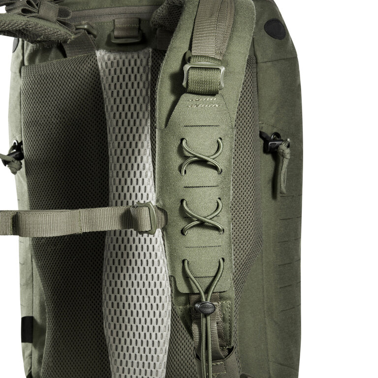 25 mm popruh umožňuje upevnenie na ramenný popruh alebo D-krúžok, čo zaisťuje flexibilitu pri organizácii vášho vybavenia. Možnosť fixácie vybavenia pomocou elastickej šnúry poskytuje dodatočnú stabilitu počas pohybu. Moderný, laserom rezaný MOLLE systém umožňuje pevné a spoľahlivé pripevnenie puzdier či príslušenstva k ramennému popruhu batohu.