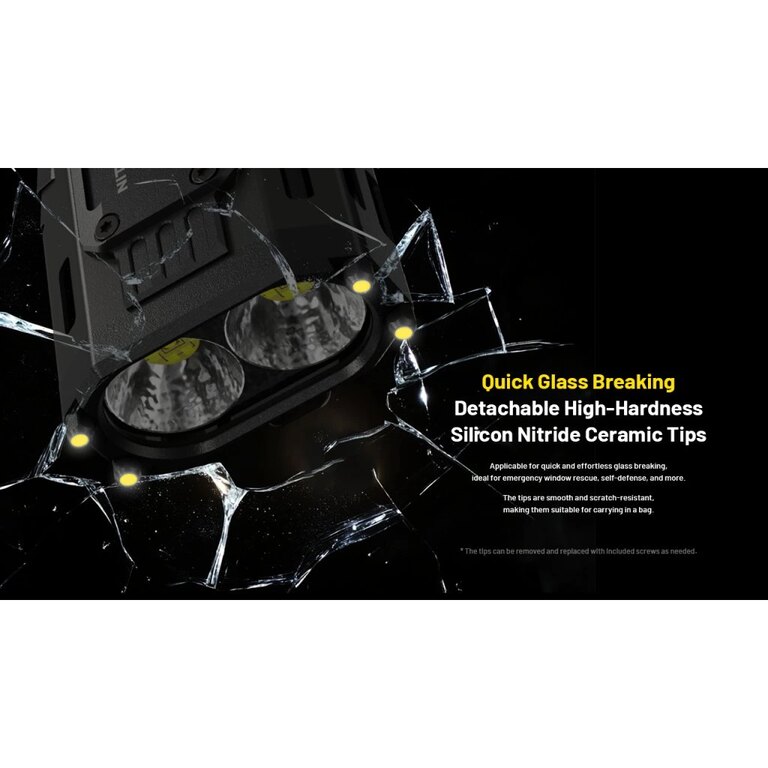 Do výbavy patria keramické hroty schopné okamžite rozbiť sklo, rovnako ako remienok a nabíjací kábel v balení. Malé rozmery a hmotnosť pod 200 gramov z nej robia spoľahlivého parťáka do služby aj na výpravy do prírody.
