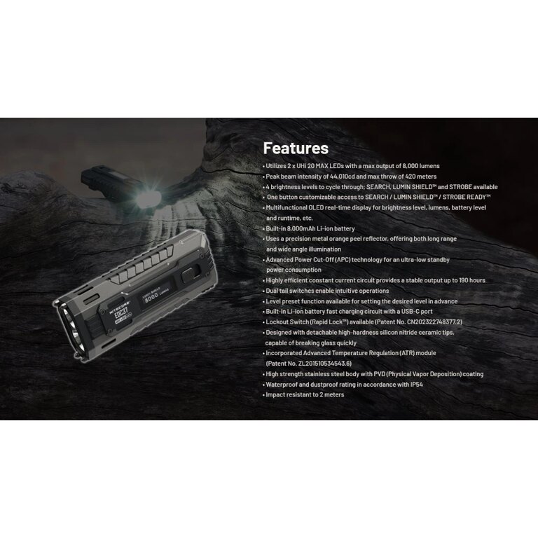 | Ďalšie špecifikácie | Vlajková loď Nitecore® na rok 2025 Počet LED: 2 biele Typ LED: 2× Dual NiteLab® UHi 20® Max - 2× UHi 20® + 2× 8 pomocných jadier (UHi 20® - špeciálne vyvinuté LED nové éry, v porovnaní s bežne dostupnými LED sú o cca o 41 % menšie (2,26 mm²) a majú o cca 43 % väčšiu svetelnú hustotu (876 lm / mm²)) Presný kovový textúrovaný reflektor (orange peel reflector) ponúka dlhý dosvit a širokouhlé osvetlenie Svetelný kužeľ: bodový / úzky lúč (primárne LED jadro) aj rozptyl (pomocné LED jadrá) --- Ovládanie: 2 taktické tlačidlá na konci svietidla Dostupné režimy: biele svetlo rôznej intenzity - 4 + 3 špeciálne módy - taktický stroboskop, Search a Lumin Shield™ Lumin Shield™ - vytvorí svetelný múr podobný štítu pre veľmi účinnú osobnú obranu Stroboskop 2. generácie - zapnutie/vypnutie 1 rukou, náhodné striedanie frekvencie v rozsahu 16 Hz až 20 Hz - silnejší oslňujúci efekt Možnosť prednastavenia úrovne výkonu Rýchle nabíjanie prostredníctvom portu typu USB-C priamo na svietidle Inteligentné rýchle nabíjanie s výkonom 18 W, plné nabitie za 2 h, na nabitie použite nabíjačku alebo powerbanku, ktorá podporuje protokoly rýchleho nabíjania PD/QC OLED display zobrazuje v reálnom čase zvolený režim, zostávajúcu dobu svitu na daný režim, režim uzamknutia, stav batérie a indikátor dobíjania Funkcia uzamknutia v 2 režimoch: režim 1 - uzamknuté iba tlačidlo On / Off (tlačidlo Tactical zostáva k dispozícii pre rýchly prístup k režimom Lumin Shield™, Search a Stroboskop) a režim 2 - uzamknuté obe tlačidlá (ideálne pre prepravu svietidla) Rapid Lock™ - rýchle uzamknutie svietidla pomocou posuvníka na strane (patent č. CN202322748377.2) Klip na nosenie vo vrecku alebo na opasku, možnosť pripnutia istiacej šnúry (súčasťou dodávky) Unikátny protišmykový povrch (čaká na patentovanie EU aj US, patent č. CN2024206649950) pre istý a bezpečný úchop holou rukou aj v rukaviciach Veľmi tvrdé keramické hroty na rozbíjanie skla vpredu --- Vysoko účinný obvod so stálym prúdom poskytuje stabilný výkon Technológia APC (Advanced Power Cut-Off) pre extrémne nízku spotrebu energie v pohotovostnom režime Pokročilá regulácia teploty - ATR (Advanced Temperature Regulation) (patent č. ZL201510534543.6) Nový systém mriežky na odvod tepla vyvažuje pekný vzhľad a praktické využitie - poskytuje efektívny a rozsiahly odvod tepla, udržuje vysoký výkon bez prehrievania a pohodlné držanie v ruke --- Maximálna doba svitu: 190 h Maximálna svietivosť: 44 010 cd Krytie: IP54 (ochrana pred usadeným prachom, vydrží bežný dážď) Nárazuvzdornosť: do 2 m |