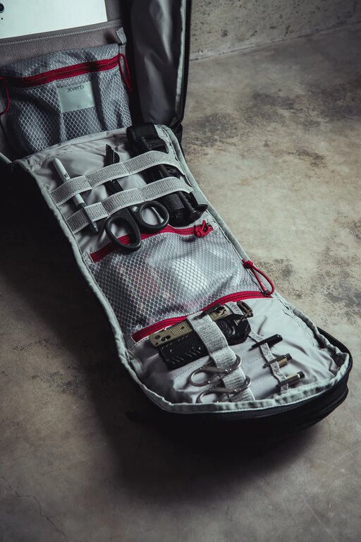 Svetlý interiér zlepšuje orientáciu aj v horších svetelných podmienkach. Sieťované vrecká, sloty na výbavu, suché zipsy a kotviace body držia obsah pod kontrolou. Predné admin vrecko ponúkne sloty na zásobníky alebo lekárničku a elastické úchyty pre modulárne doplnky. Dvojvrstvová priehradka ochráni notebook aj ďalšie zariadenia a spodná časť umožní uchytenie príslušenstva kompatibilného so suchým zipsom.
