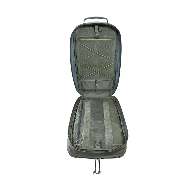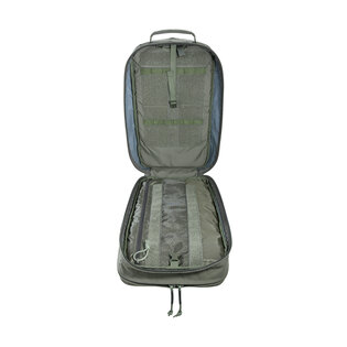 Dve hlavné komory sa otvárajú po celom obvode, takže obsah batohu je ihneď prístupný. Predná časť obsahuje štyri odnímateľné vrecká na suchý zips s priehľadným vekom a ploché organizéry vo veku na dokumenty a drobnosti, zatiaľ čo zadná komora ponúka veľkú plochu na suchý zips a MOLLE lišty pre úpravu vnútorného rozloženia.