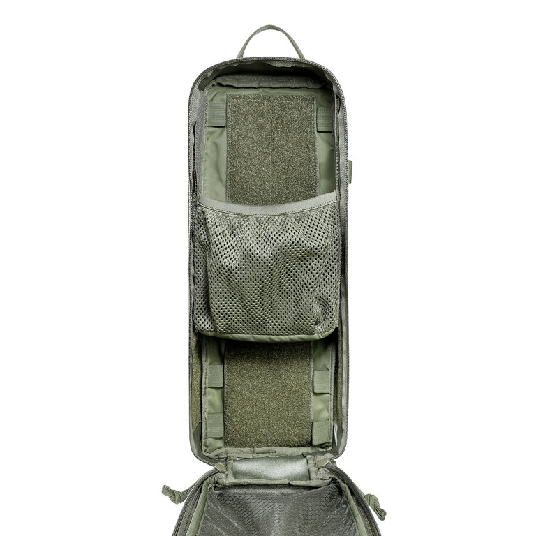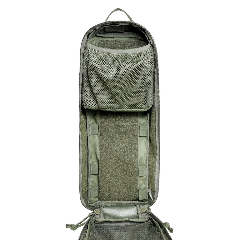 Vnútro vrecka má MOLLE plochy, ktoré umožnia pripojiť ďalšie vrecká alebo organizéry podľa potreby. Polstrovaný delič možno nastaviť tak, aby vznikli dve samostatné sekcie – ideálne pre rýchle rozdelenie vybavenia. Sieťované a zipsové vrecká udržia poriadok aj pri rýchlom vyberaní vecí.