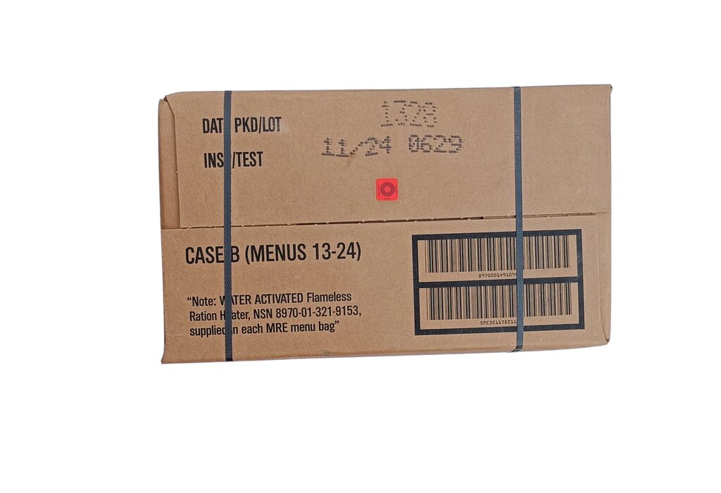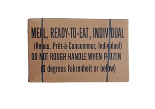 | Súčasťou dodávky | Balené v papierovej krabici napustenej zmesou, ktorá má odpudzovať hlodavce Škatuľa by mala byť odolná proti plesni (funkčnosť nezaručená - neoverené) Obsahuje 12 menu Každé menu obsahuje: Hlavné jedlo Soľ a korenie Príloha/snack - chlieb, tortilla apod. Maslo/nátierka Krekry/sušienky Dezert/sladkosť Nápoj (nápojový prášok) 1× plastová lyžica Bezplamenný ohrievač jedla aktivovaný vodou (NSN 8970-01-321-9153) Obrúsok a ďalšie doplnky |