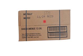 Táto krabica obsahuje kompletné menu A z amerických potravinových dávok MRE. Vo vnútri sa nachádza dvanásť rôznych hlavných jedál, ktoré tvoria základ jednotlivých armádnych dávok. Každé jedlo je balené samostatne, takže sa dávky dajú využívať postupne podľa potreby.