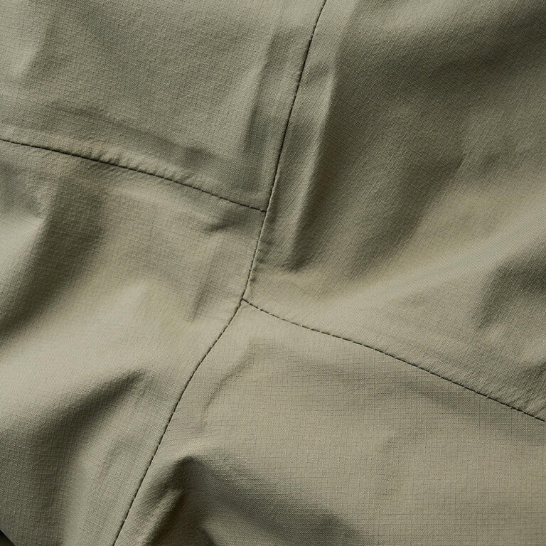 Odsadené švy zmenšujú množstvo prešitia, čím znižujú hmotnosť a zvyšujú životnosť. Laminované lemy, manžety aj šilt kapucne spevňujú exponované miesta a držia tvar aj pri častom používaní. Dvojcestný vodeodolný zips YKK Aquaguard a nastaviteľný spodný lem chránia pred počasím, ale neobmedzujú pohyb.