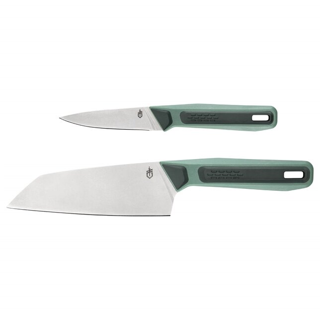 Gerber vybavil sadu dvoma kuchynskými nožmi – menším na presnejšiu prácu a väčším na hlavnú prípravu. Ostrie z nehrdzavejúcej ocele zvláda časté krájanie a drží ostrosť aj pri častom používaní. Rukoväte z polypropylénu s pogumovanou časťou dobre sedia v ruke a nešmýkajú, ani keď pracujete s mokrými surovinami.
