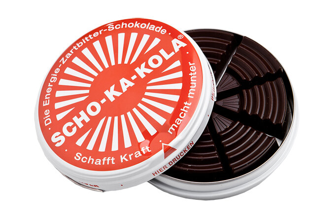 Energetická čokoláda Scho-ka-kola® je legendárna nemecká energetická čokoláda, ktorá sa v pôvodnej horkej verzii vyrába už od roku 1935, v mliečnej verzii potom od šesťdesiatych rokov 20. storočia. A stále letí. Dodávaná je a vždy bola v slávnej okrúhlej plechovke s výrazným dizajnom bielych lúčov na červenom / modrom pozadí. Balenie obsahuje 100 g tejto energetickej bomby v 16 chutných dielcoch.