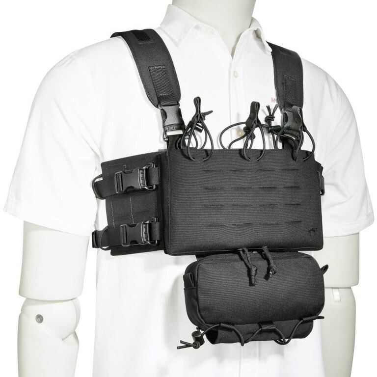 Vysokej univerzálnosti je docielené hlavne tým, že jednotlivé prvky možno vybrať a vymeniť. Predná časť postroja je vybavená modulom na zásobníky, ktorý možno úplne odstrániť alebo pretvoriť podľa potreby. Prepážky v puzdre možno premiestniť tak, že sa do nich zmestia buď 3 x M4 (PMAG) zásobníky, alebo 4 x pištoľové / MP7. Zásobníky sú na svojom mieste zaistené bungee cordom s pútkom pre jednoduché uvoľnenie. Celý hrudný modul je vybavený systémom MOLLE, takže k nemu môžete pripevniť ďalšie puzdrá. Na zadnej časti nájdete suchý zips, ktorý umožňuje použiť ho aj samostatne ako prednú chlopňu pre nosič plátov. Spodné vrecko na príslušenstvo, veľkostne podobné puzdru Tac Pouch 12, je ľahko oddeliteľné. Dve bočné chlopne, z ktorých každá je vybavená systémom MOLLE v prevedení Lasercut, možno tiež jednoducho odstrániť.