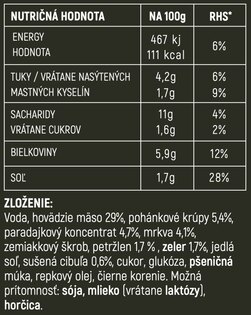 Vo vnútri sa skrýva kombinácia jemných kúskov hovädzieho mäsa a pikantného gulášu, doplnená nadýchanou pohánkovou kašou. Žiadne náhrady, len poctivé suroviny, ktoré zasýtia a dodajú energiu. Chutí tradične, ale zvláda tempo dnešnej doby – stačí pár minút a je hotovo.