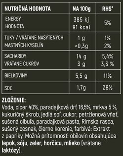 Vege Power je vhodná nielen do batoha turistov, ale aj do dielne, kancelárie alebo ako zásoba doma. Dlhá trvanlivosť a kompaktné balenie z nej robia spoľahlivú zálohu pre chvíle, keď nie je čas ani priestor variť. Stačí pár minút a máte istotu teplého, chutného jedla bez zbytočných starostí.