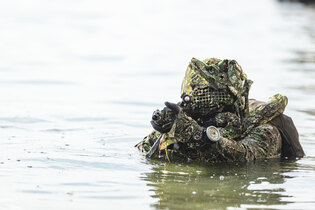 Maskovací oblek DIVER CAMO má výstuž Cordura na lakťoch aj kolenách aj kamufláž pre chrbty rúk. Dodáva sa vrátane krytu potápačskej masky. Oblek sa používa cez mokré aj suché oblečenie.