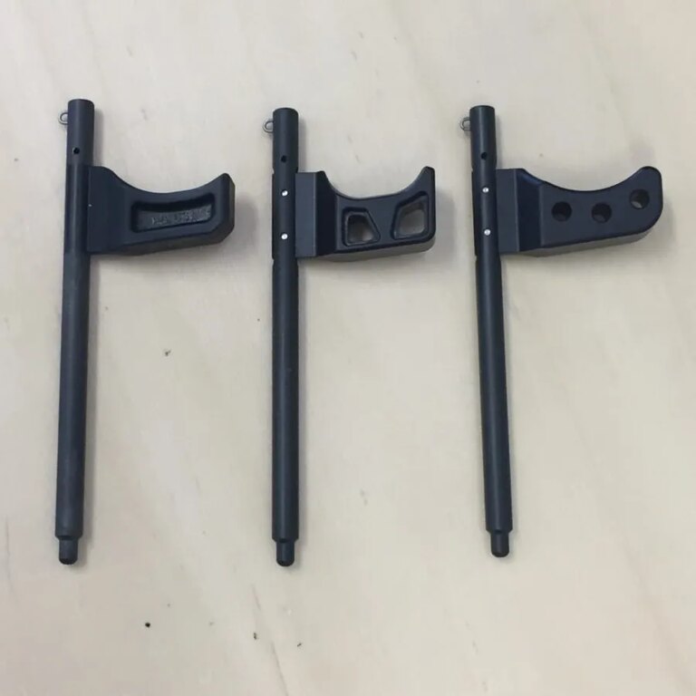 Hmatník páky je obrábaný z hliníka 6061-T6 a opatrený tvrdým eloxom podľa štandardu MIL-A-8625. Vodiaca tyč je z brúsenej nerezovej ocele, navyše čierno nitridovaná pre zvýšenie odolnosti. Vďaka kombinácii materiálov a precíznemu spracovaniu vydrží aj náročné používanie bez straty funkcie alebo hladkosti chodu.
