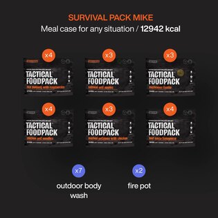 Survival Pack Mike je navrhnutý pre náročné podmienky, kde je spoľahlivá výživa a hygiena kľúčová. Obsahuje 21 porcií výživných jedál s celkovou energetickou hodnotou 12 942 kcal, čo zabezpečuje dostatok energie na sedemdňové obdobie. Súčasťou balenia je tiež 7 jednorazových sprch pre základnú hygienu a 2 ohrievače Fire Pot pre jednoduché ohriatie jedál bez potreby otvoreného ohňa.