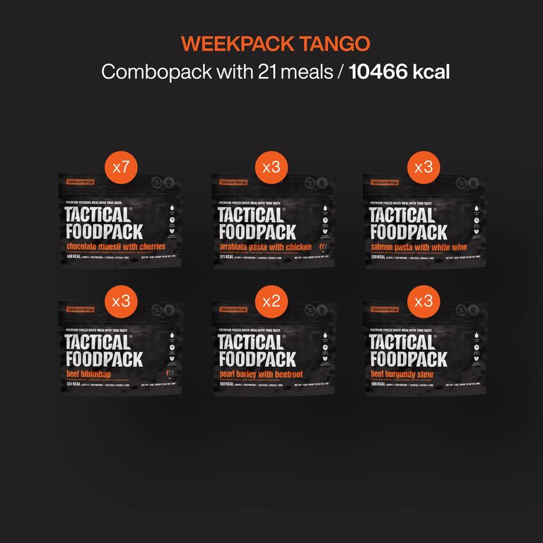 Weekpack Tango je navrhnutý tak, aby poskytol kompletné stravovacie potreby jedného človeka na sedem dní. Obsahuje 21 rôznorodých jedál – od sladkých raňajok po sýte hlavné chody. Každé jedlo je lyofilizované (sušené mrazom), čo zaisťuje dlhú trvanlivosť až 4 roky a zachovanie chuti aj nutričných hodnôt.
