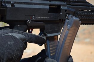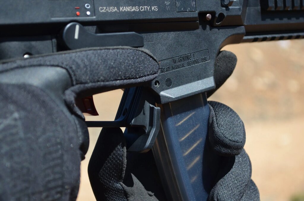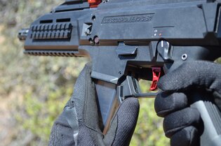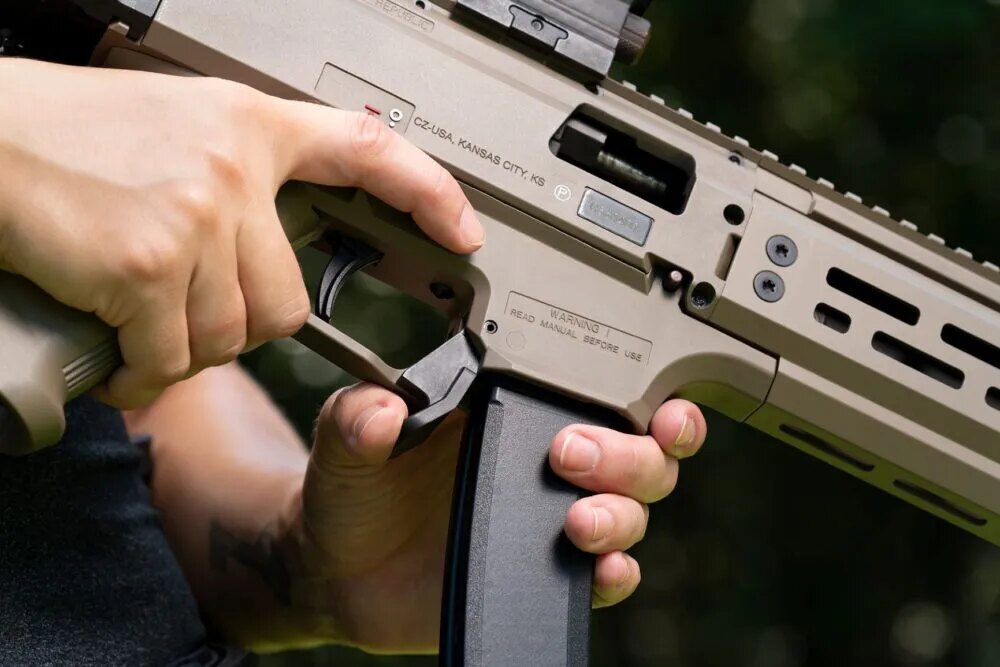 Rozšírená dolná časť pripomínajúca „kačací zobák“ vytvára veľkú kontaktnú plochu. Umožňuje tak spoľahlivý úchop aj pod tlakom alebo v rukaviciach. Zadná strana páčky je plná a pomáha pri zasúvaní nového zásobníka, pretože tvorí plynulý nábeh do šachty. Každý detail tu má svoj dôvod.