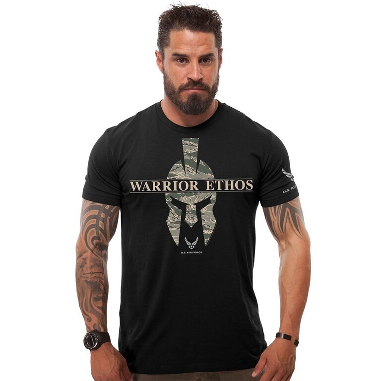 Toto tričko nemá žádnou konkurenci, vše je originál, potisk je považován za umělecké dílo a je chráněn autorskými právy (copyright ©). Výrazný potisk trička vpředu i vzadu je navržen a vytištěn v USA a je proveden nejmodernější dostupnou technologií, inkousty na vodní bázi změkčenými plastisolem (suspenze PVC s přidanými plastifikátory). Vpředu na hrudi nápis WARRIOR ETHOS a obrázek helmy spartského bojovníka vyvedený v moderním maskovacím vzoru U.S. Air Force a na levém rukávu malý nápis a logo U.S. AIR FORCE.