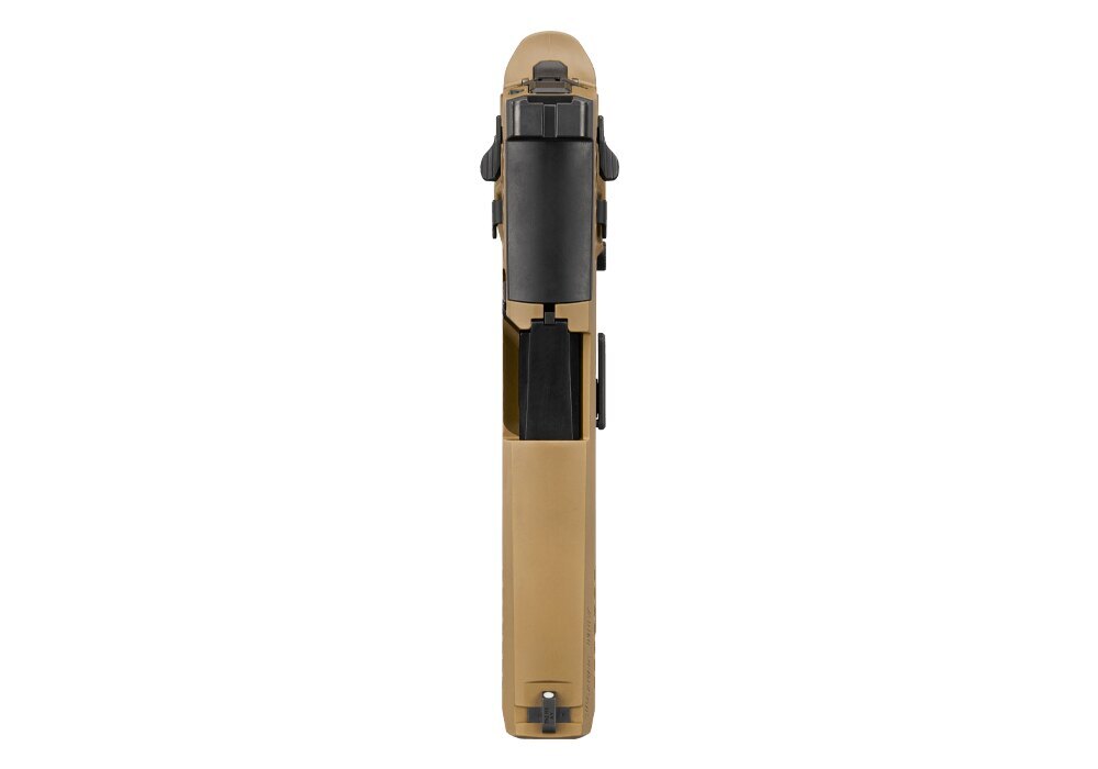 Disponuje manuálnou poistkou a záchytom záveru prístupným z oboch strán, a záchyt zásobníka je možné prehodiť pre pravákov aj ľavákov. Táto obojstranná konfigurácia zvyšuje komfort aj bezpečnosť obsluhy v prevádzke. Ovládacie prvky majú čierne prevedenie v kontraste s pieskovým rámom, čo udržiava prehľadnosť ovládania.