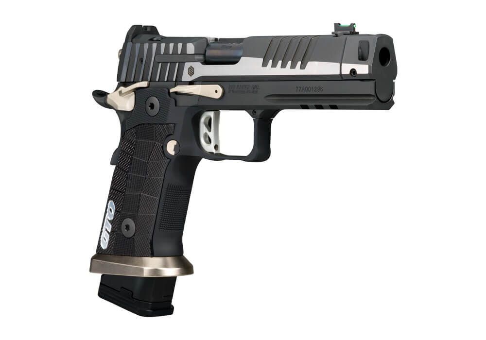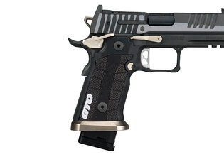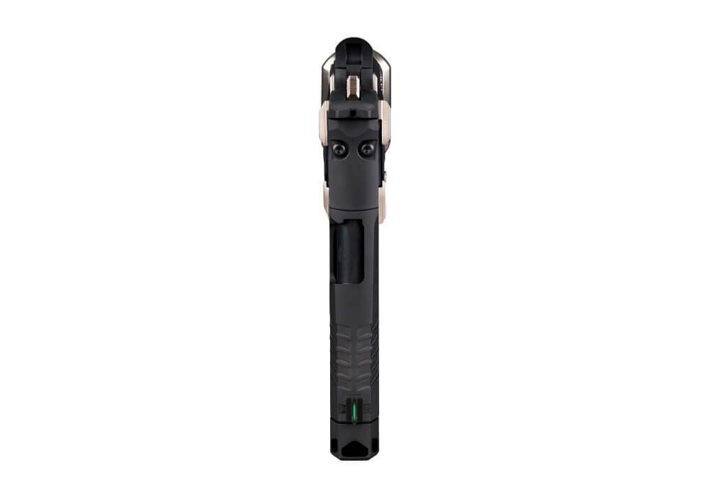 Plochá skeletizovaná spúšť systému Single Action Only (SAO) podporuje konzistentné a čisté spúšťanie s krátkym a presným chodom. Model je vybavený manuálnou poistkou, ktorá mechanicky blokuje chod spúšte pri jej aktivovaní a dopĺňa bezpečnú manipuláciu so zbraňou. Pištoľ je osadená muškou so svetlovodným vláknom a čiernym hľadím bez zvýraznenia, čo umožňuje rýchle a intuitívne zamierenie pri dynamickej streľbe.