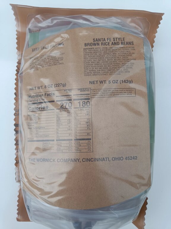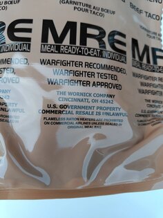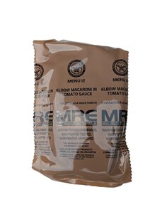 | Ďalšie špecifikácie | Originálna vojenská potravinová dávka používaná armádou USA Kompletné jedlo v 1 balení Hermeticky uzavretý obal Vysoká energetická hodnota Bez potreby variča alebo ohňa - ohrievač dodávaný v každom menu Použitie ohrievača bezpečné aj v interiéri Dlhá trvanlivosť (pri správnom skladovaní) Ako pripraviť MRE: Vložte sáčok s jedlom do priloženého ohrievača Pridajte malé množstvo vody Počkajte približne 10 min až 15 min Jedlo je pripravené na konzumáciu |