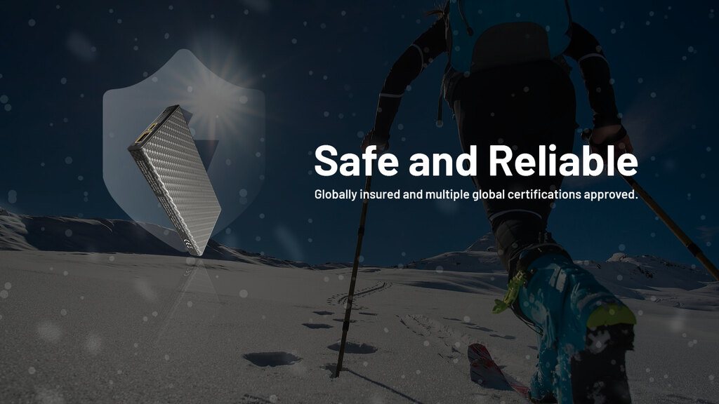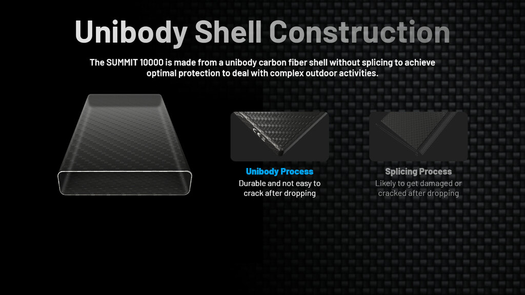 Telo z jedného kusa uhlíkového vlákna zaručuje pevnosť, nízku hmotnosť a odolnosť voči nárazom aj vode. Powerbanka zvládne pád z výšky, dážď aj sneh. Ideálny spoločník na výpravy, kde nie je miesto pre krehké vybavenie.