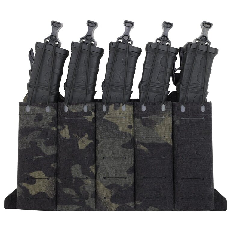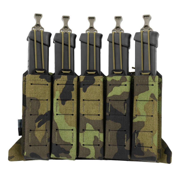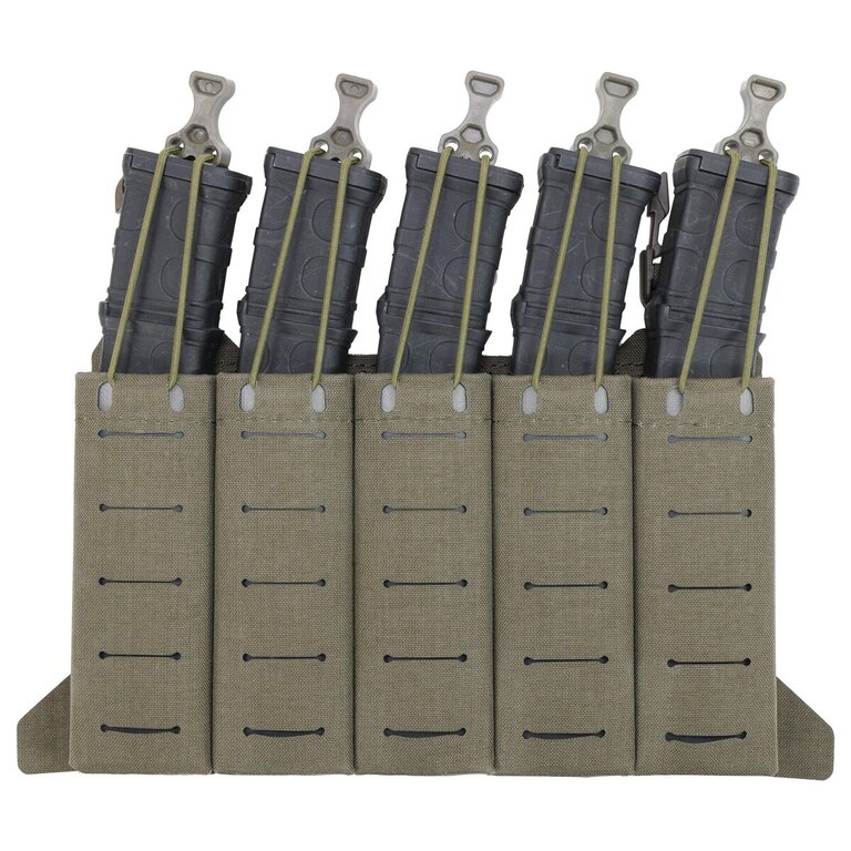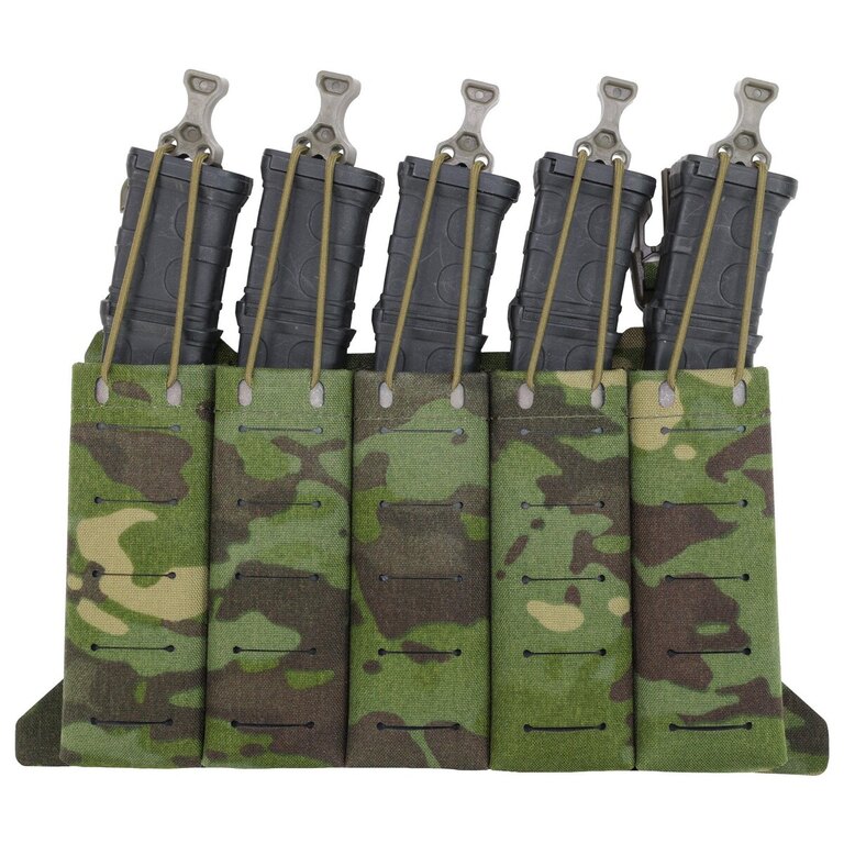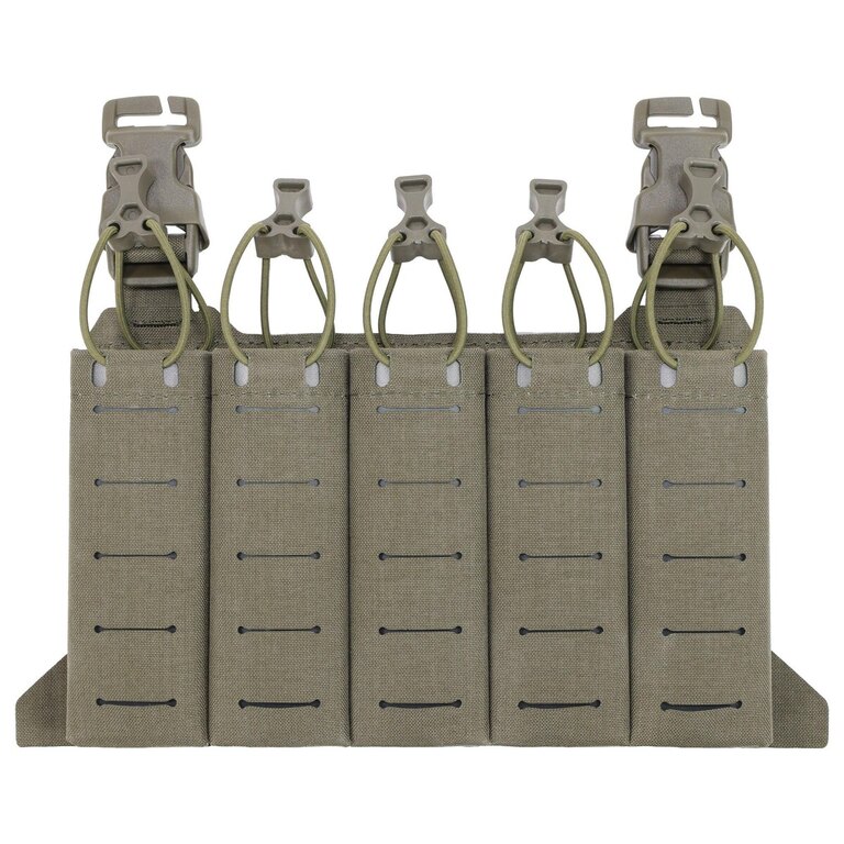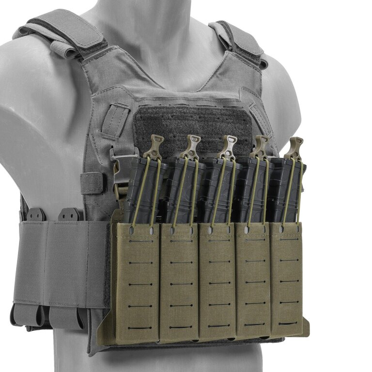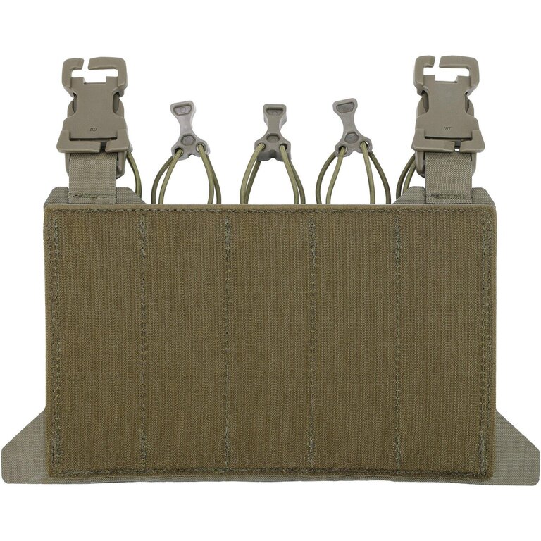Nízky profil konštrukcie zabezpečuje pohodlie aj pri dlhšom nosení. Zásobníky držia pevne na mieste vďaka pružným popruhom a elastickým vsadkám, ktoré zároveň uľahčujú ich rýchle vytiahnutie v kritických momentoch. Na povrchu panelu sa nachádza MOLLE/PALS väzba pre integráciu ďalšieho vybavenia.
