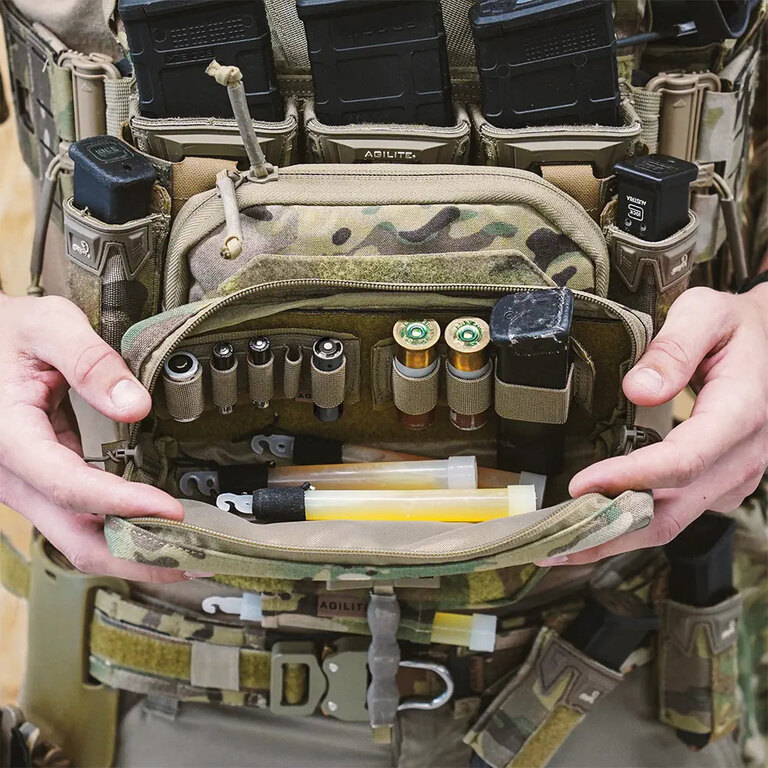 Púzdro Rear Hanger Agilite Gear je uložené vzadu, ale prístup k nemu máte aj sami. Ergonomické pútko a rýchloodnímateľný systém umožnia vrecko otvoriť aj zatvoriť jediným ťahom. A keď je to potrebné, dá sa dočasne pripevniť dopredu na suchý zips nosiča alebo sumky, aby bol obsah hneď po ruke.