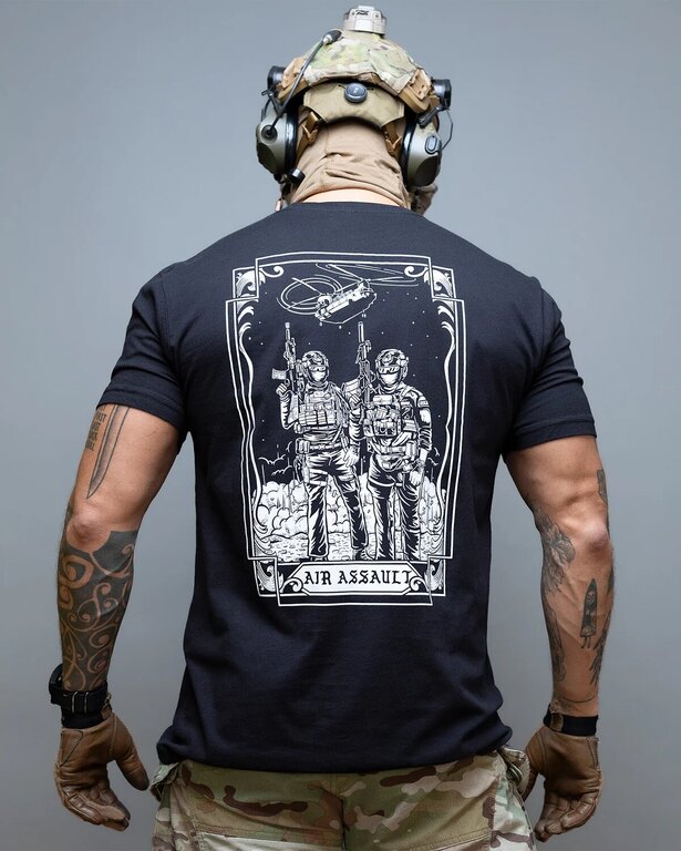 Dizajn trička Air Assault predstavuje holandského a nemeckého výsadkára, symbolizujúc medzinárodné bratstvo a odvahu výsadkových jednotiek. Tento motív vznikol v spolupráci s @the__trace, čo zaisťuje autentickosť a rešpekt k tým, ktorí slúžia.