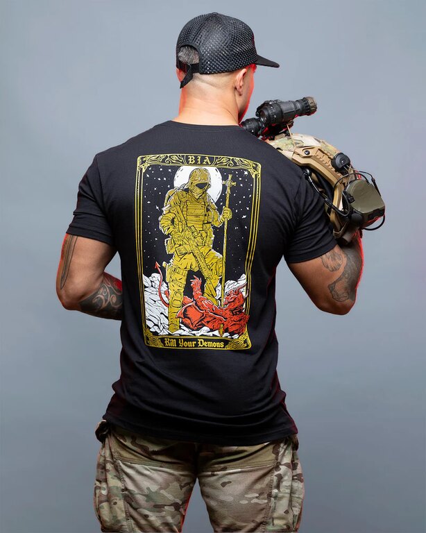 Brothers in Arms nie je o trendoch, ale o princípoch. Je to značka pre tých, ktorí chápu, že česť, disciplína a odhodlanie nie sú frázy. Každý motív má svoj význam – a tričko Demons to hovorí jasne: ak chcete rásť, musíte najprv zničiť to, čo vás brzdí.