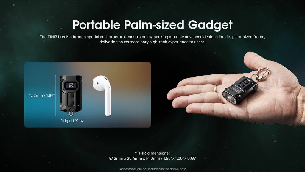 TINI 3 sa nosí bez povšimnutia – vo vrecku, na kľúčoch aj na batohu. Nízka hmotnosť v kombinácii s odolnou konštrukciou a ochranou proti vode aj nárazom z nej robí spoľahlivú voľbu pre každodenné fungovanie. Či už ide o krátke cesty po meste, kempovanie alebo rýchlu kontrolu okolia, TINI 3 je vždy po ruke.