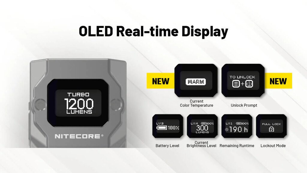 Integrovaný OLED displej ukazuje všetko podstatné v reálnom čase – od zvoleného režimu cez stav batérie až po odhad výdrže. Nitecore TUP2 tak eliminuje dohady a umožňuje rýchlo reagovať na meniace sa podmienky. Displej zjednodušuje ovládanie a pridáva istotu, že svietidlo beží presne tak, ako má.