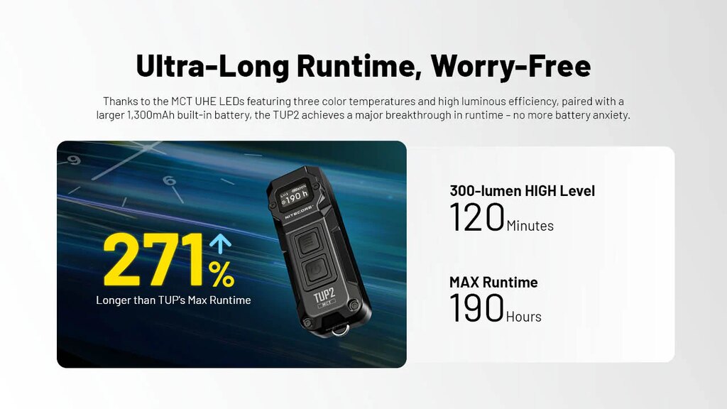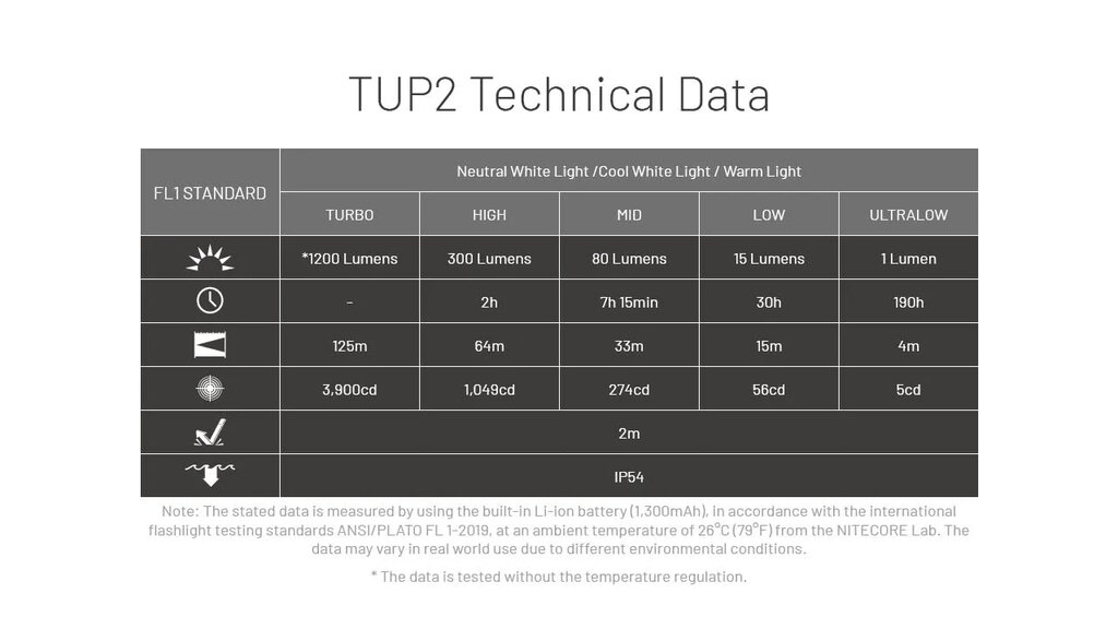 Nitecore TUP2 ponúka širokú škálu jasov, od jemného svetla pre orientáciu po extrémne silný záblesk. Vďaka efektívnemu riadeniu výkonu zvláda dlhé hodiny prevádzky a drží stabilný svit v celom priebehu. Stačí si vybrať režim a svetlo sa postará o zvyšok.