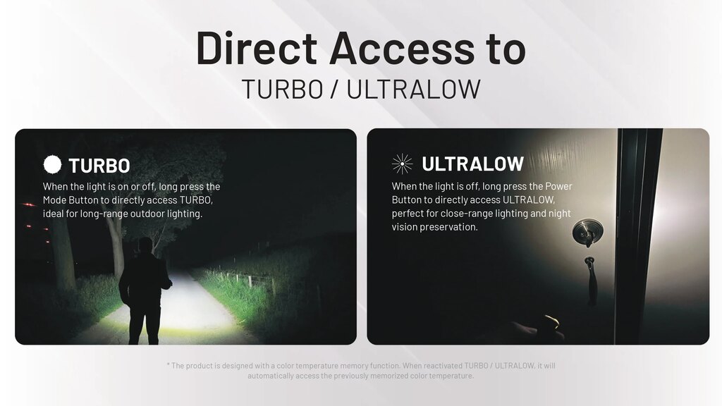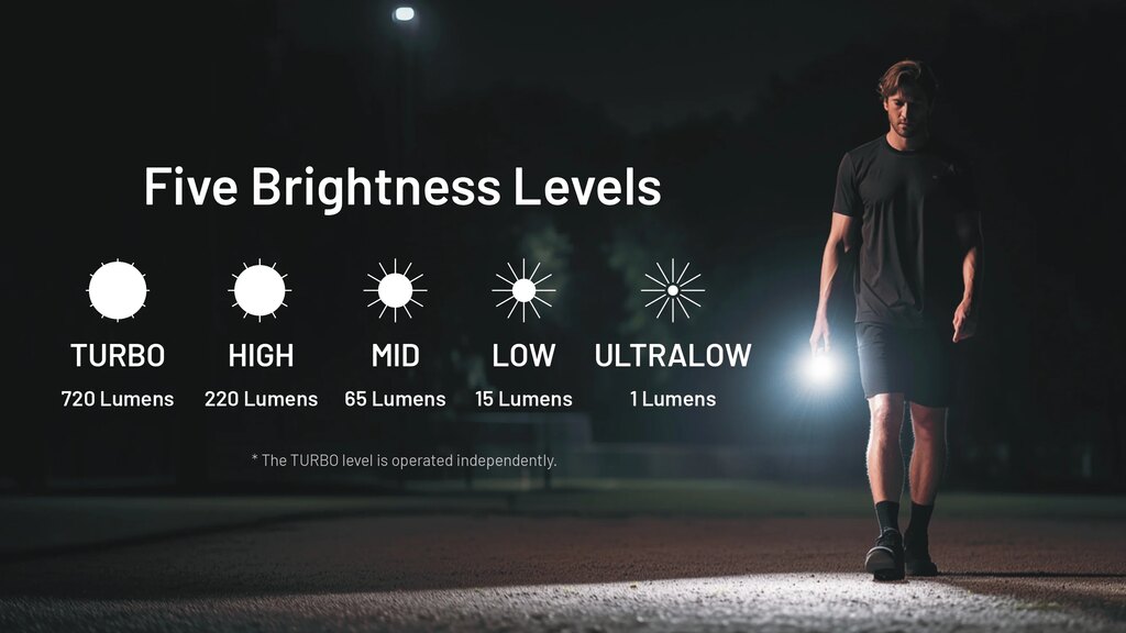 Dve tlačidlá, jasná logika a okamžitý prístup k plnému výkonu. TIP3 reaguje presne tak, ako sa od vreckovej baterky očakáva. Nechýba ani veľmi slabý režim pre nenápadné svietenie, napríklad v stane alebo v aute. Zámok proti nechcenému zapnutiu zabezpečí, aby sa svetlo nerozsvietilo samo vo vrecku alebo na kľúčoch.