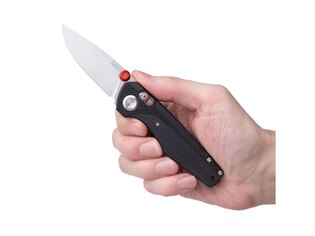Čepeľ sa otvára jednou rukou pomocou obojstranného kolíka s výrazným červeným prvkom. Chod je plynulý a čitateľný, bez trhnutí a zbytočného odporu. Konštrukcia vychádza z väčšieho modelu A200 a zachováva jeho osvedčené technické riešenie. Zatvorenie prebieha istotne a kontrolovane.