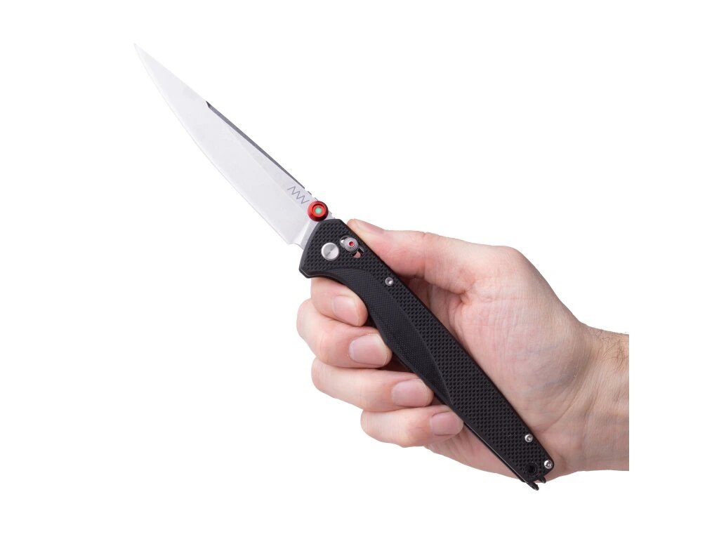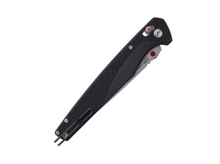 Rukoväť je osadená črienkami z čierneho materiálu G10. Tento materiál je ľahký, pevný a bežne používaný u nožov určených na každodenné nosenie. Tvarovanie rukoväte umožňuje dlhý a stabilný úchop bez nutnosti agresívnej textúry. Povrch je navrhnutý tak, aby nôž pevne držal v ruke a zároveň sa pohodlne nosil vo vrecku.