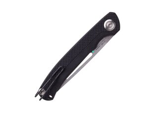 Rukoväť z materiálu G10 kombinuje dve rozdielne textúry. Hrubšia horná časť pozdĺž chrbtice zvyšuje istotu držania, jemnejšia spodná časť podporuje komfort pri dlhšom používaní. Výrez pre ukazovák pomáha s vedením prsta a čiastočne supluje záštitu. Dlhšia rúčka prispieva k stabilnému úchopu aj napriek nízkej hmotnosti noža.